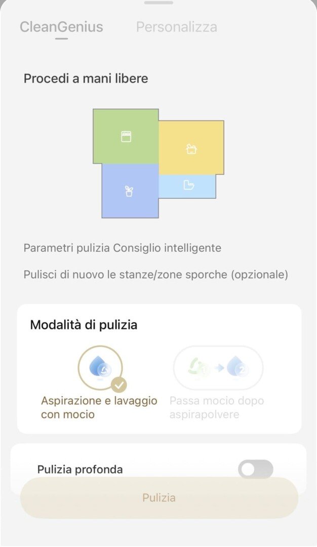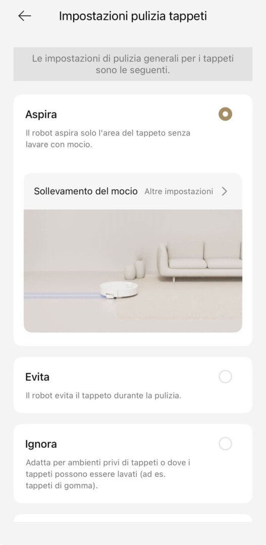 Posso ad esempio dire al robot di aspirare al massimo e lavare con molta acqua in cucina, e di fare un passaggio leggero e silenzioso in camera da letto.