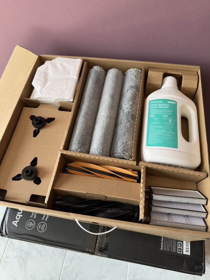 Si viene letteralmente sommersi da ricambi e accessori pensati per coprire le esigenze del lungo periodo. Troviamo filtri aggiuntivi per la polvere, spazzole laterali di scorta, una generosa fornitura di liquido detergente specifico per pavimenti e persino due profumatori ambientali.